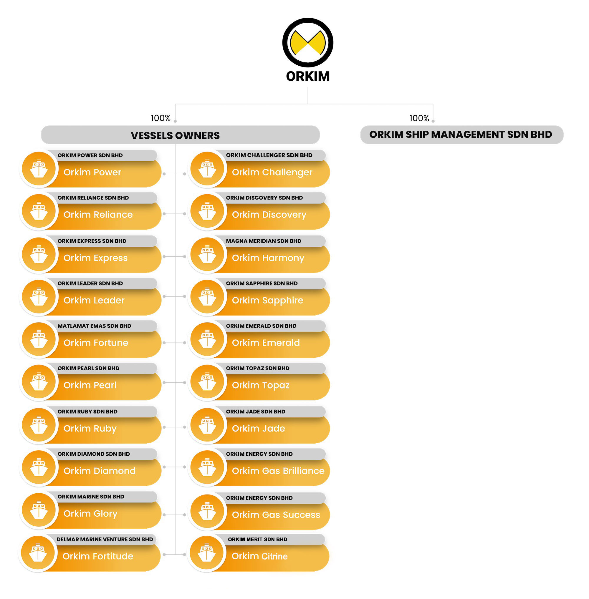 Orkim Berhad operates through a fully-owned network of subsidiaries managing vessel ownership, licensed operations, ship management, and brokerage — ensuring streamlined, end-to-end control of marine transport and logistics operations.